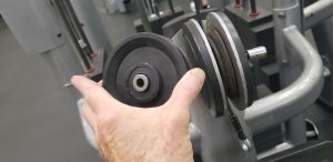 The main Cable machine in our Northeast gym is made by the LifeFitness company.  One of the stations is the bench row and is a popular back exercise.  Like all the stations, a stranded wire cable travels over two pulleys from the handle in your hands to the weight stack.  These plastic pulleys wear out over time and need replaced eventually.  This happened last July and I received a mail message that the station was out of order.